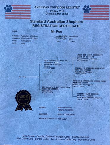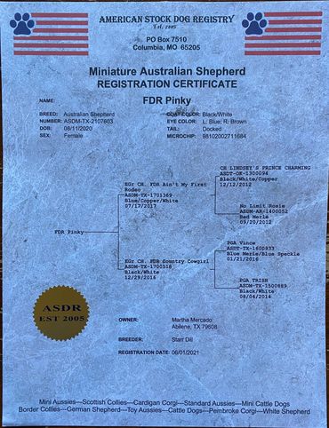 I am a small breeder from Coleman Co. Tx. All my life I have raised and adopted many breeds of dogs. It is my pride and joy to have chosen to raise Minnie and standard Aussies. I keep it small to give them the best tender loving care they deserve. All my Aussies sold are ASDR Registered and health tested before letting them go to there forever homes.